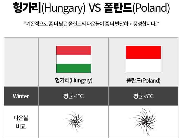 전체 다운 중 솜털과 깃털이 차지하는 비율에 따라 가격 차이가 발생합니다. (80/20 or 90/10)